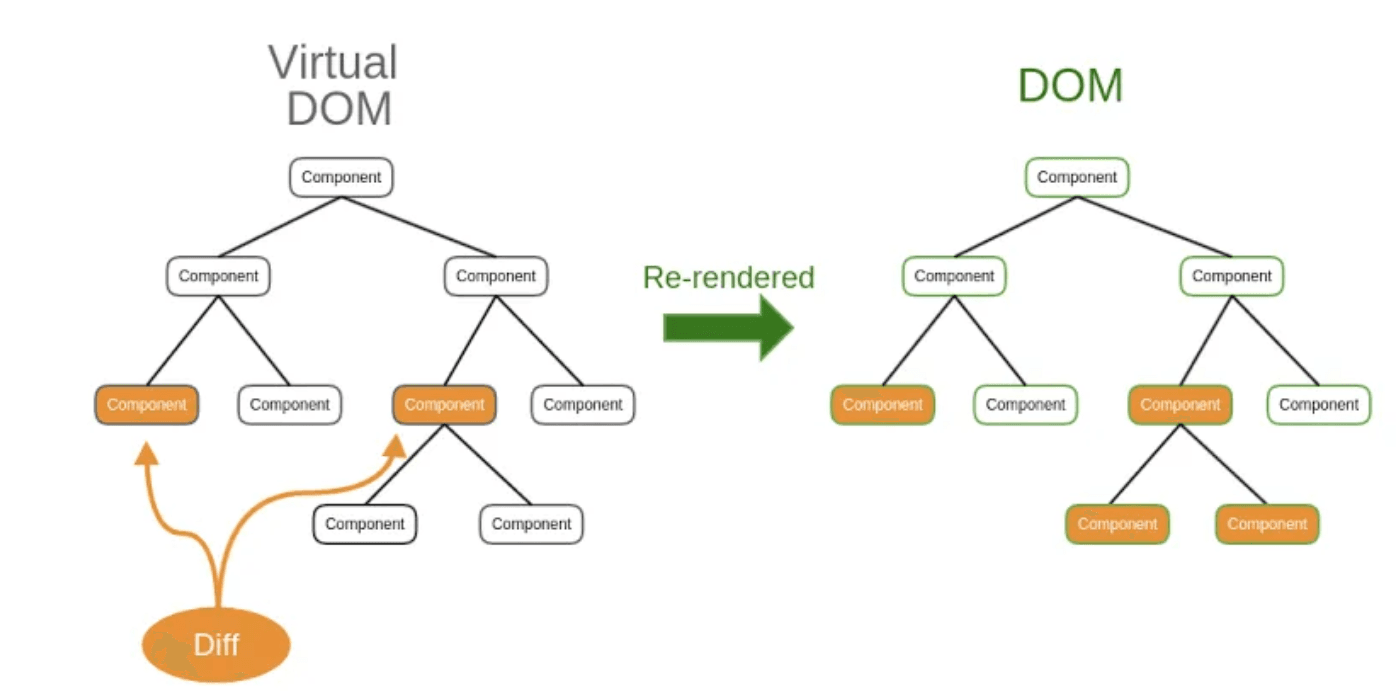 The React component tree plays a vital role in updating the user interface. If a component changes state or gets new props, it must be re-rendered to the screen, and at the same time, all children of that component must be re-rendered as well. This is where the advantage of the tree structure comes in, where it is easy to see which components on the screen need to be updated. At the same time, React uses the VDOM, where it compares its in-memory stored DOM of the current and previous version, and then when it detects that the component has changed not only its state or its props but also its actual UI, it updates it's in the browser DOM.
