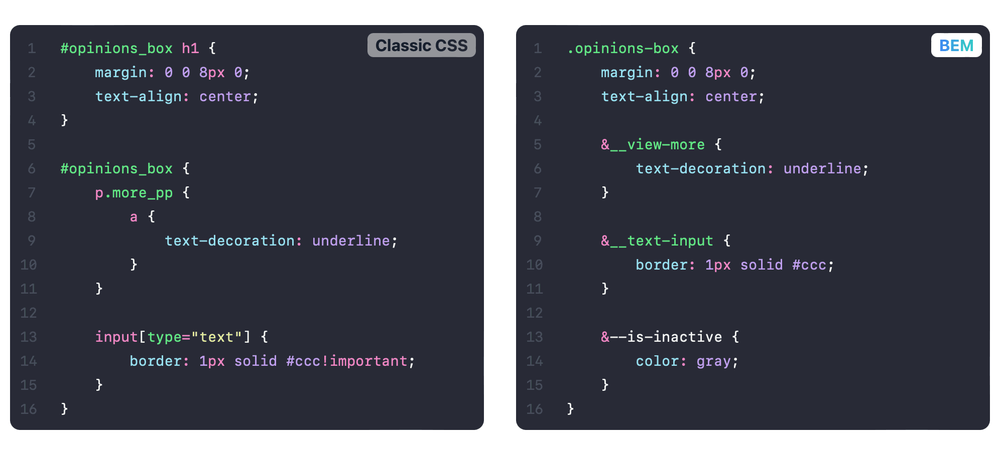 Although it's mighty, traditional CSS can become unwieldy in larger projects, as maintaining consistency and avoiding conflicts can be challenging. Also, thinking about suitable class names is HARD. There are some standards that developers can follow, for example, BEM.