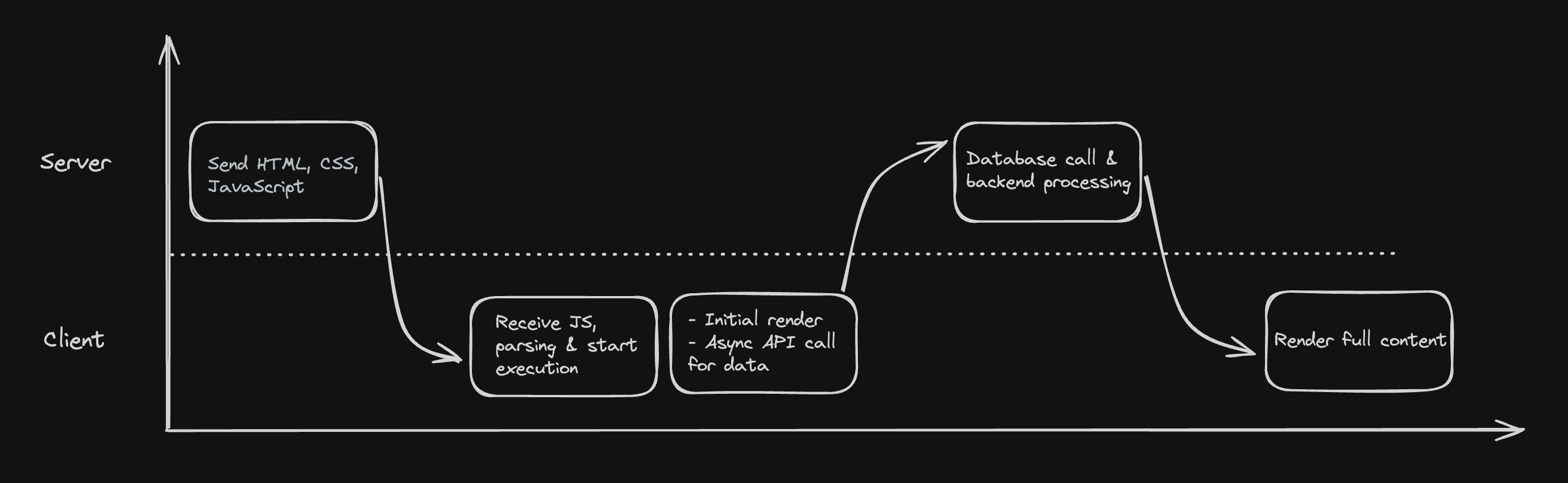 The first step is for the client (for example, in a browser) to access the URL where the application is running. The server intercepts this request and returns all the files the application needs to run. After the client receives these files, a blank page from the server is presented. Now, it needs to parse the JS files, which can then render something. JS will typically render some loading state initially and send an asynchronous request back to the server to get the data. The server again catches the request, performs database calls, and returns the data. The client processes the data and renders it to the page.
