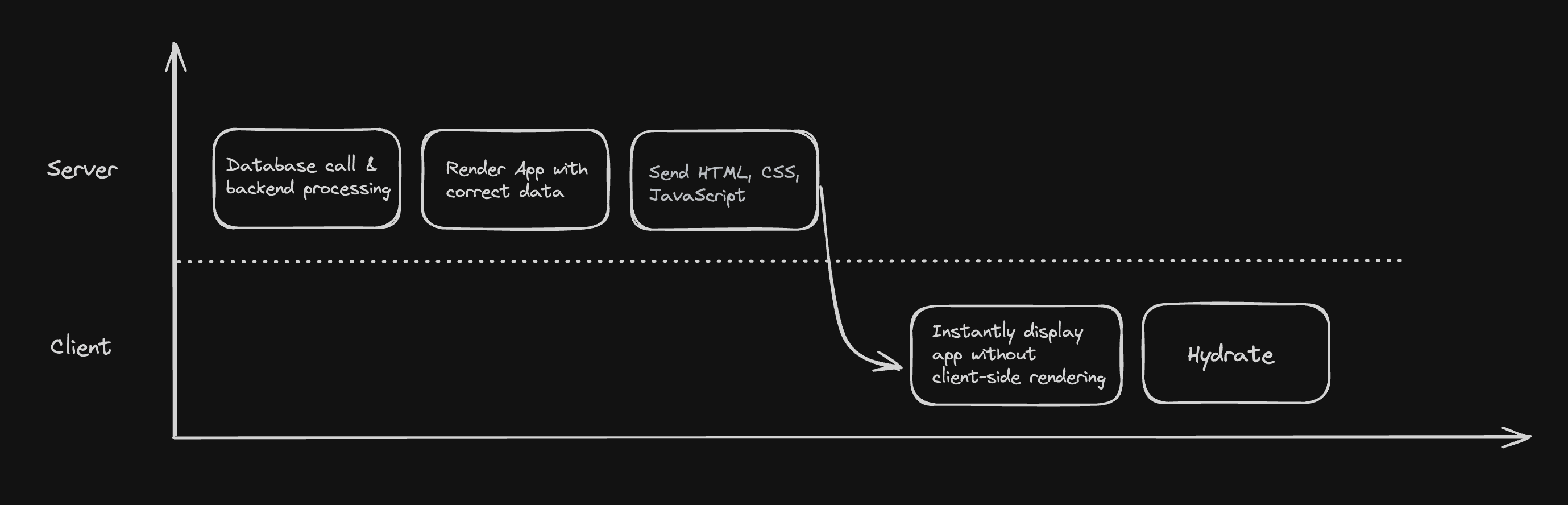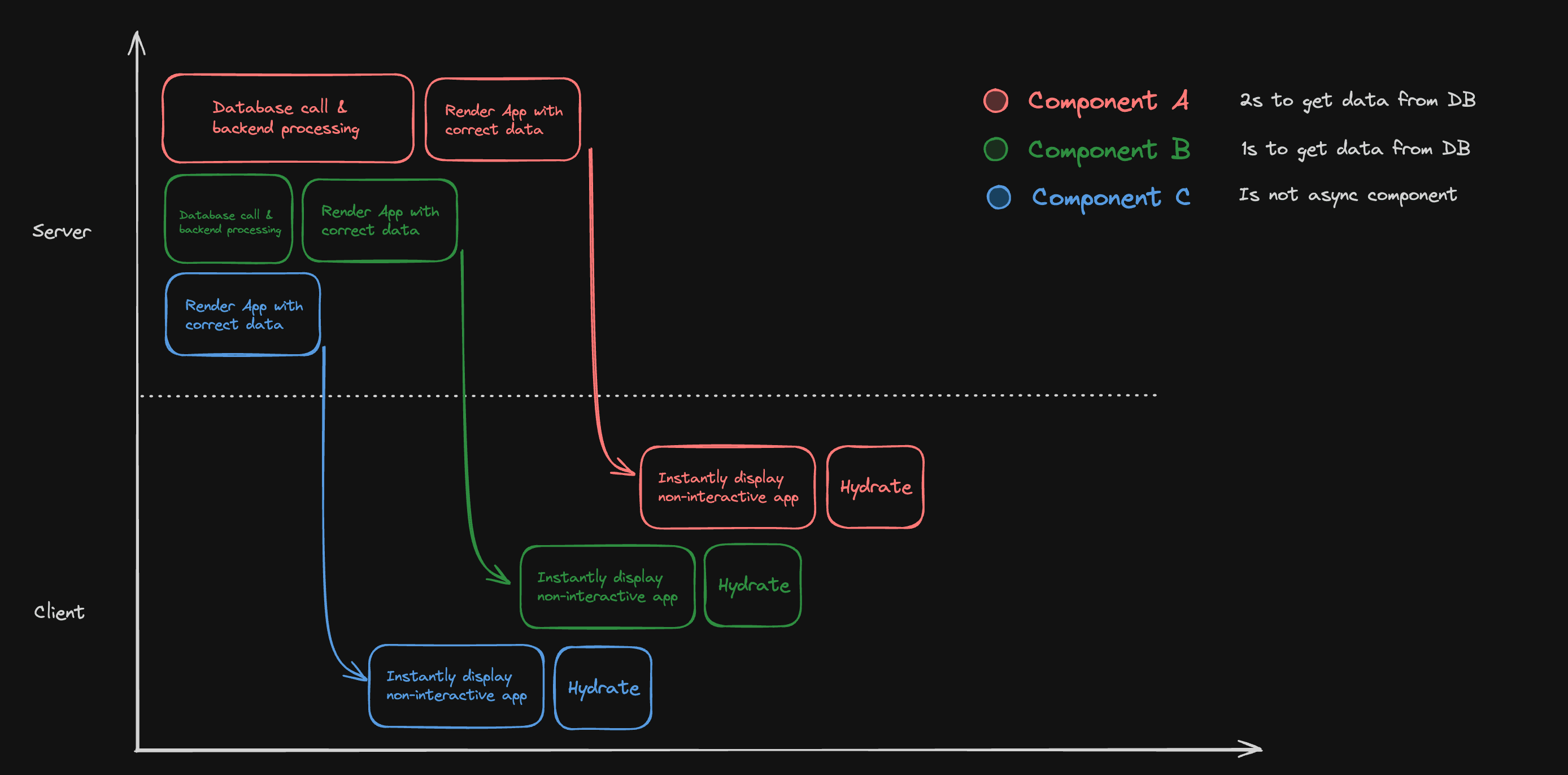 Instead of having the server and client exchange requests back and forth, we do all the work needed for the first render immediately on the server before sending it to the client for the first time. However, this model is only possible with the ability to get the data directly on the server while rendering the React component only on the server. Until recently, this model was the only one regarding SSR capabilities in React.