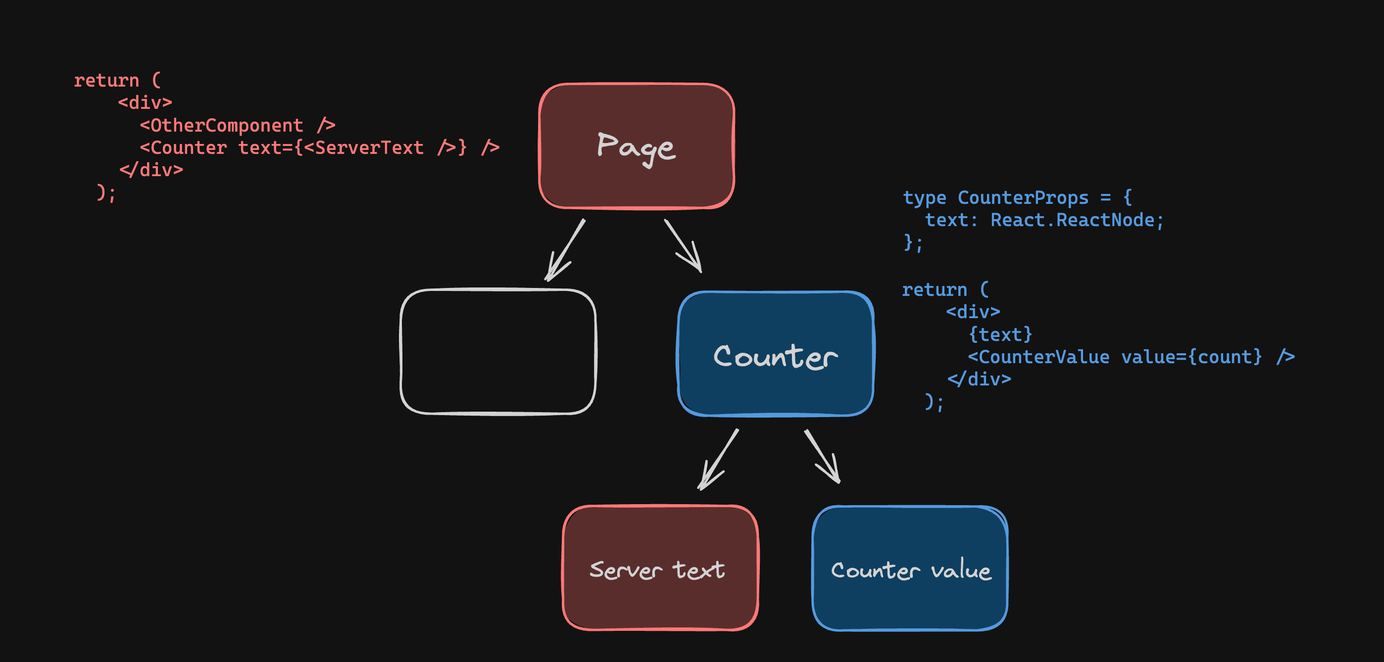 Countercomponent directly to thePagecomponent, which is not a Client component and can therefore render Server components. We send theServerTextcomponent as a props to theCountercomponent.