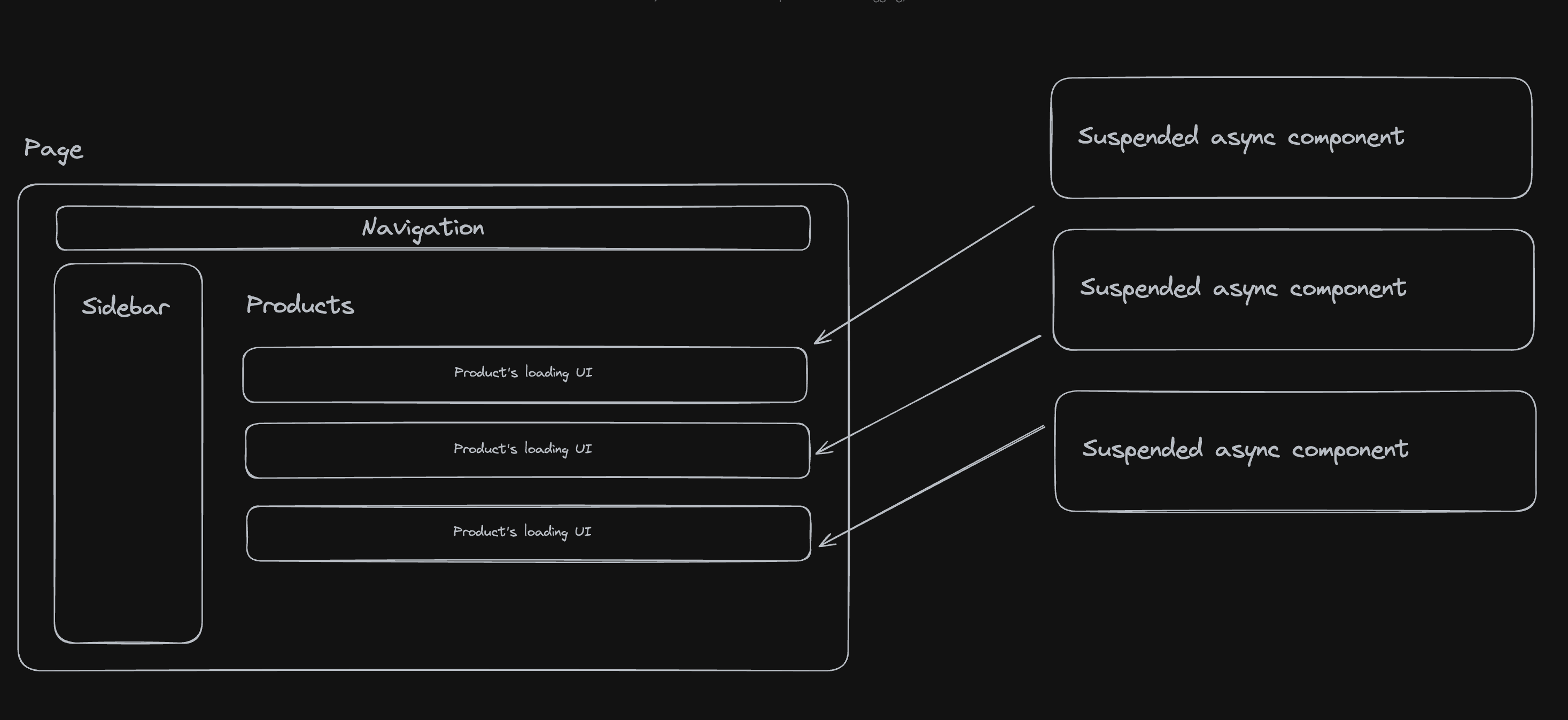 Suspenseboundary. Once React reaches a component that requires server-side data fetching, it will search for the first suspense boundary and display its fallback, if available. In this example,AlbumsAsyncComponentis the only async component inside theSuspenseboundary. Once this component finishes its rendering, theSuspenseboundary will switch to rendering the actual UI. All of the components insideSuspenseboundary will be displayed together.